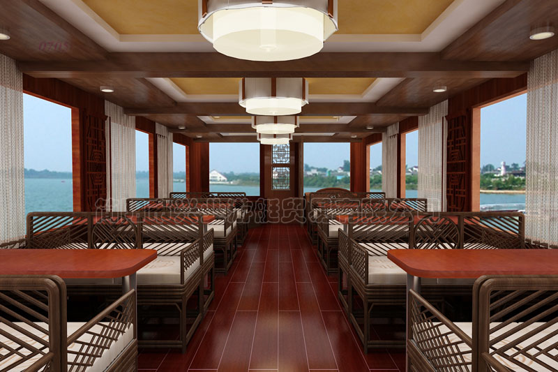 鑲嵌鋼化玻璃,客艙上下采用浮雕花格,使整個游艇達(dá)到仿古的效果。舷內(nèi)外機和舷外