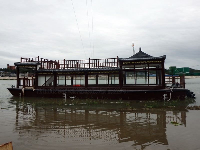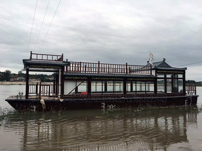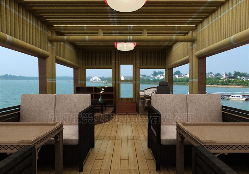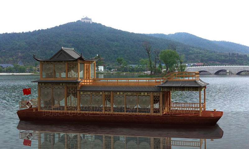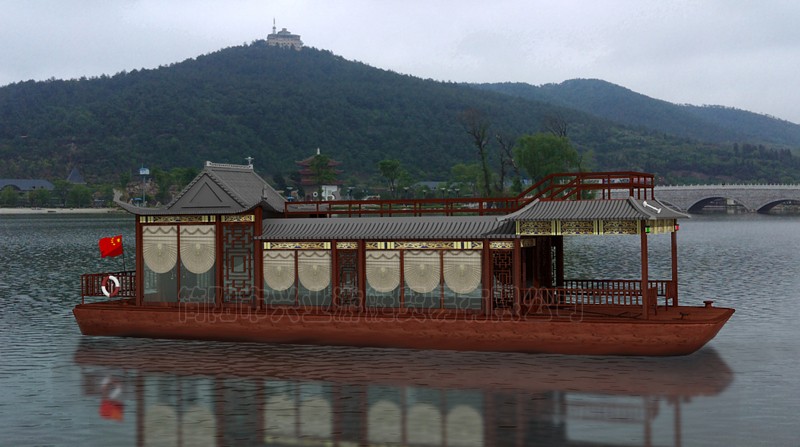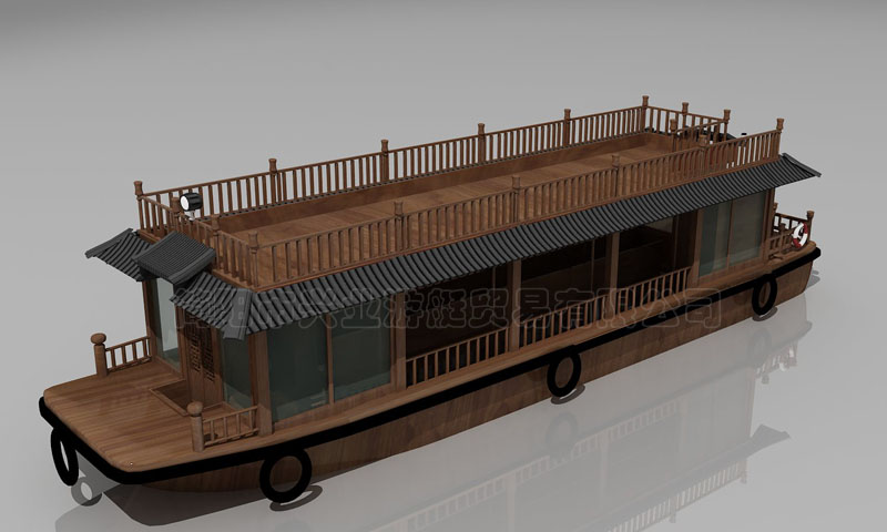 甲板及畫舫屋頂均采用玻璃鋼制造,上層結(jié)構(gòu)采用木機構(gòu)畫舫造型。墻面采用鋁合金窗